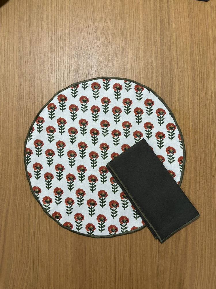 Individual de algodón resinado anti manchas de la colección Cazorla. Redondo, de 40cm de diámetro. Estampación a una cara.