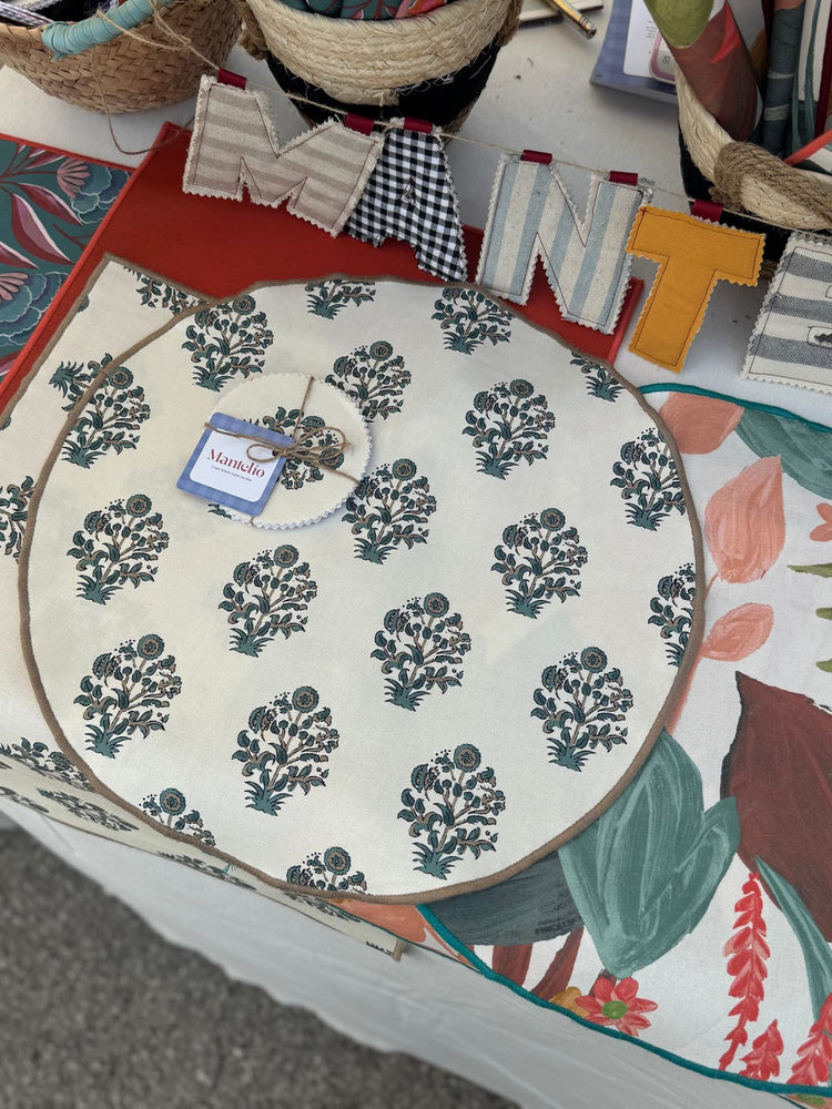 Individual de algodón resinado anti manchas de la colección Jaipur. Redondo, de 40cm de diámetro. Estampación a una cara.
