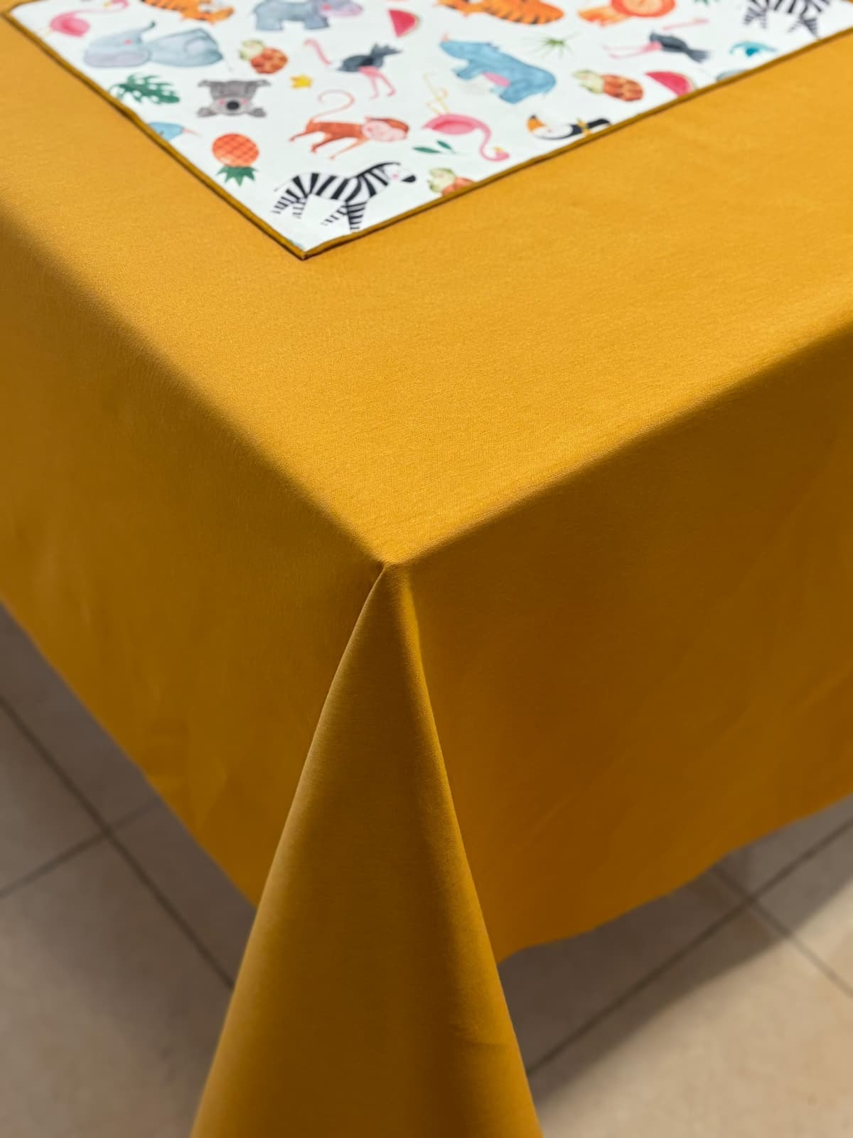 Mantel de algodón color mostaza sin resinar. Estampación a doble cara. Perfecto para mesas elegantes, sobrias y con estilo.