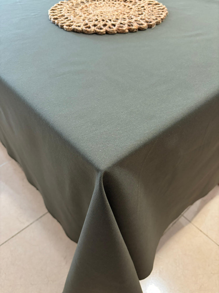 Mantel de algodón color oliva sin resinar. Estampación a doble cara. Perfecto para mesas elegantes, sobrias y con estilo.